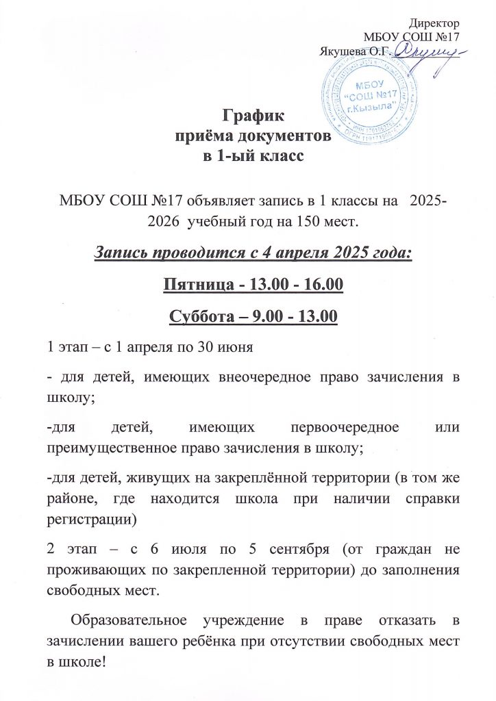 На 2025/2026 учебный год для будущих учеников, проживающих на территории, закрепленной за МБОУ СОШ №17 г. Кызыла РТ начинается запись в 1 класс.